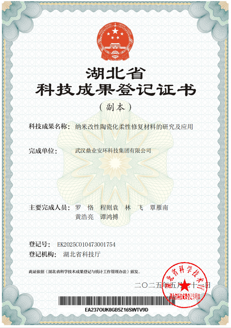祝賀!武漢鼎業(yè)安環(huán)科技集團(tuán) 《納米改性陶瓷化柔性修復(fù)材料的研究及應(yīng)用》榮獲湖北省科技成果登記證書