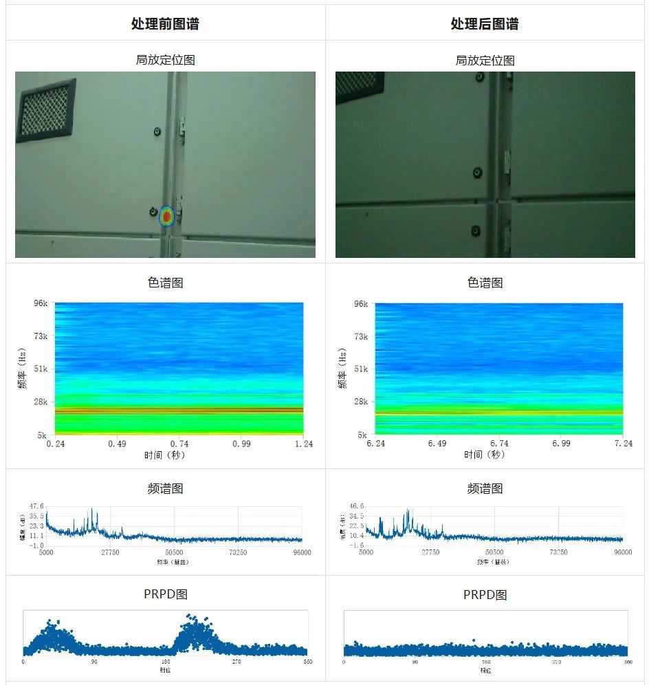 處理后:對(duì)發(fā)現(xiàn)局放的室內(nèi)穿墻套管進(jìn)行清理維護(hù),超聲成像沒有出現(xiàn)聚焦光斑,超聲波定位頻段的聲音能量和現(xiàn)場(chǎng)環(huán)境噪聲能量值一致,超聲信號(hào)的PRPD圖相位聚焦現(xiàn)象消失,局部放電問題得以消除。